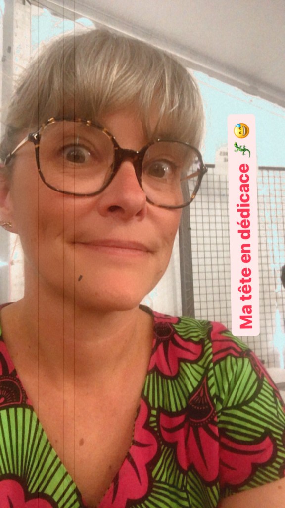 Arrivés à Alès, petit tour par notre gite qui n’était pas encore prêt et qui se révèlera être… comment dire… étrange ? chelou ? bizarre ? bourré de mauvaises ondes ? Oui, un peu de tout ça, mais pour une nuit on ne va pas faire les difficiles, non plus ! Et puis, je viens quand même présenter un livre dont l’histoire se déroule où Bénin où j’ai pas mal barroudé, donc on ne va pas faire de chichis (faudrait quand même pas voir à prendre de mauvaises habitudes et à vieillir trop vite !). Le gite n’étant pas prêt, je me change rapidement dans un lieu que l’on me propose. Un hangar. Oui, voilà, je me change dans un hangar… Pas de problème. Et puis, de toute façon, il fait tellement chaud pour la néo-montagnarde que je suis devenue, que je laisse tomber l’idée de me maquiller (moi qui ne le fais que très rarement) et de me coiffer (les soucis capillaires sont une marque de fabrique chez nous…).