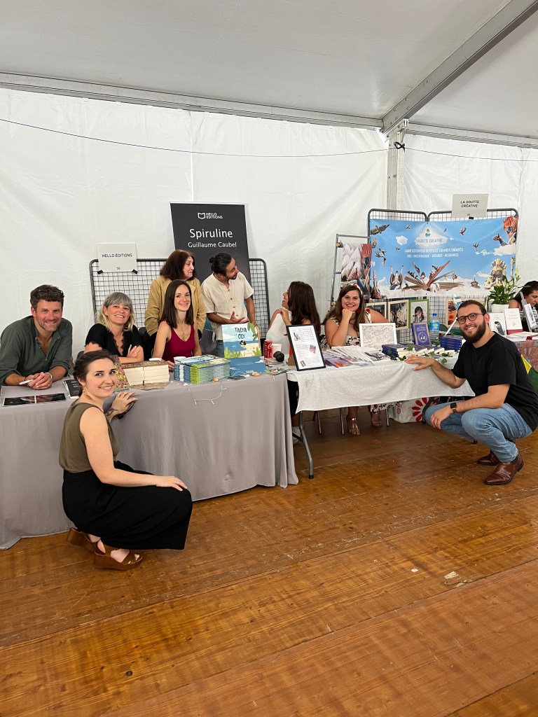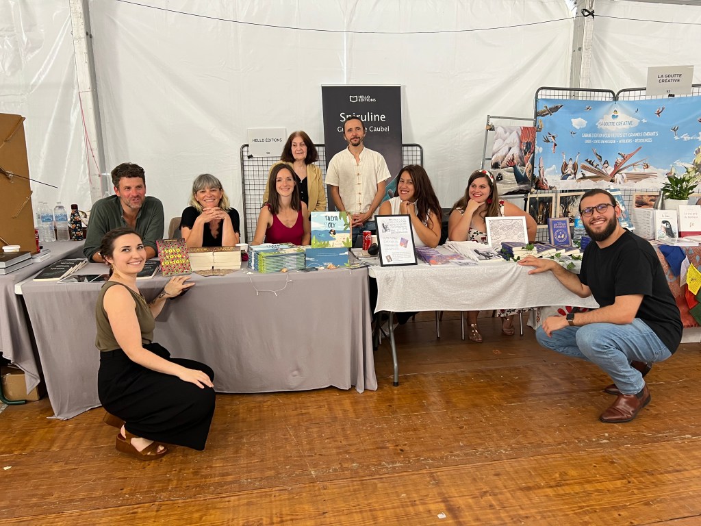 Ni une ni deux, nous voilà devant le stand de Hello Editions ! La rencontre fut naturelle, spontanée, simple, évidente, joyeuse et drôle. Autant dire, tout ce que j’aime ! Après un déjeuner en terrasse et en famille, je me joins à la folle équipe pour dédicacer.
