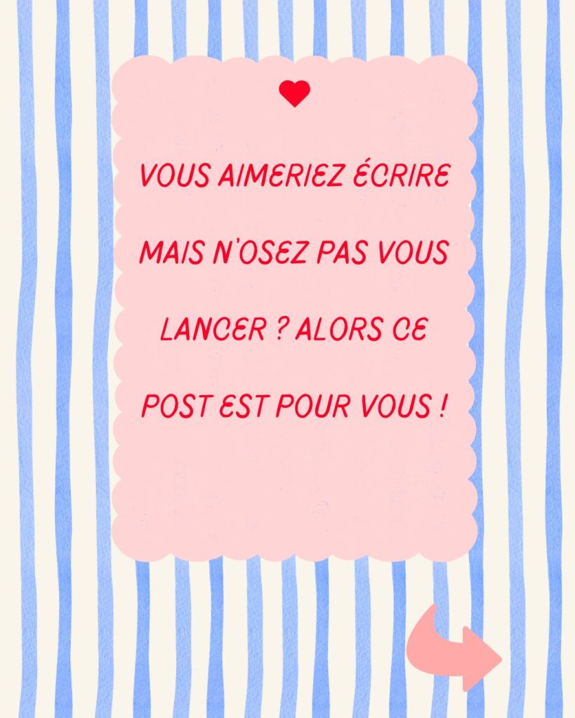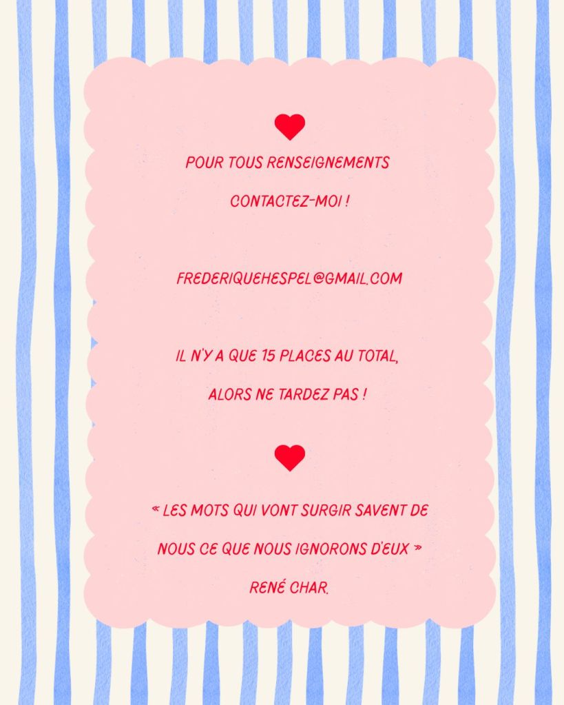 Atelier écriture, Atelier d'écriture, Auteure, L'imagination au pouvoir, Vous et moi« L’écriture dans tous ses états » 💕 7 avril 20267 avril 2026 frédériquehespelauteure Ne tenez pas compte des petites flèches aussi mignonnes soient-elles… j’ai fait de la récup des posts insta et FB 😉🫶 Partager : Partager sur X(ouvre dans une nouvelle fenêtre) X Partager sur Facebook(ouvre dans une nouvelle fenêtre) Facebook J’aime chargement… Similaire Publié par frédériquehespelauteure Auteure & réalisatrice ✨ Voir tous les articles par frédériquehespelauteure