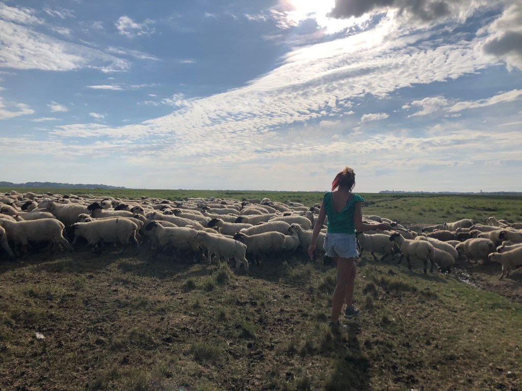 La première chose à laquelle je me suis confrontée en rencontrant Laure est le rythme intense de ses journées. Elle est venue me chercher à la gare de Noyelles-sur-Mer à 18h15 et… c’était parti ! Direction la baie, pour déplacer le parc des moutons afin qu’ils puissent paître et dormir tranquillement. Puis pour rassembler le troupeau disséminé dans l’immensité de ce lieu incroyable que je découvrais pour la première fois. Ensuite, direction la bergerie, pour nourrir et soigner les bêtes restées à l’abri car trop faibles pour la baie. Puis direction la maison, pour y déposer Pêche, Safou et Luc, ses fidèles compagnons.